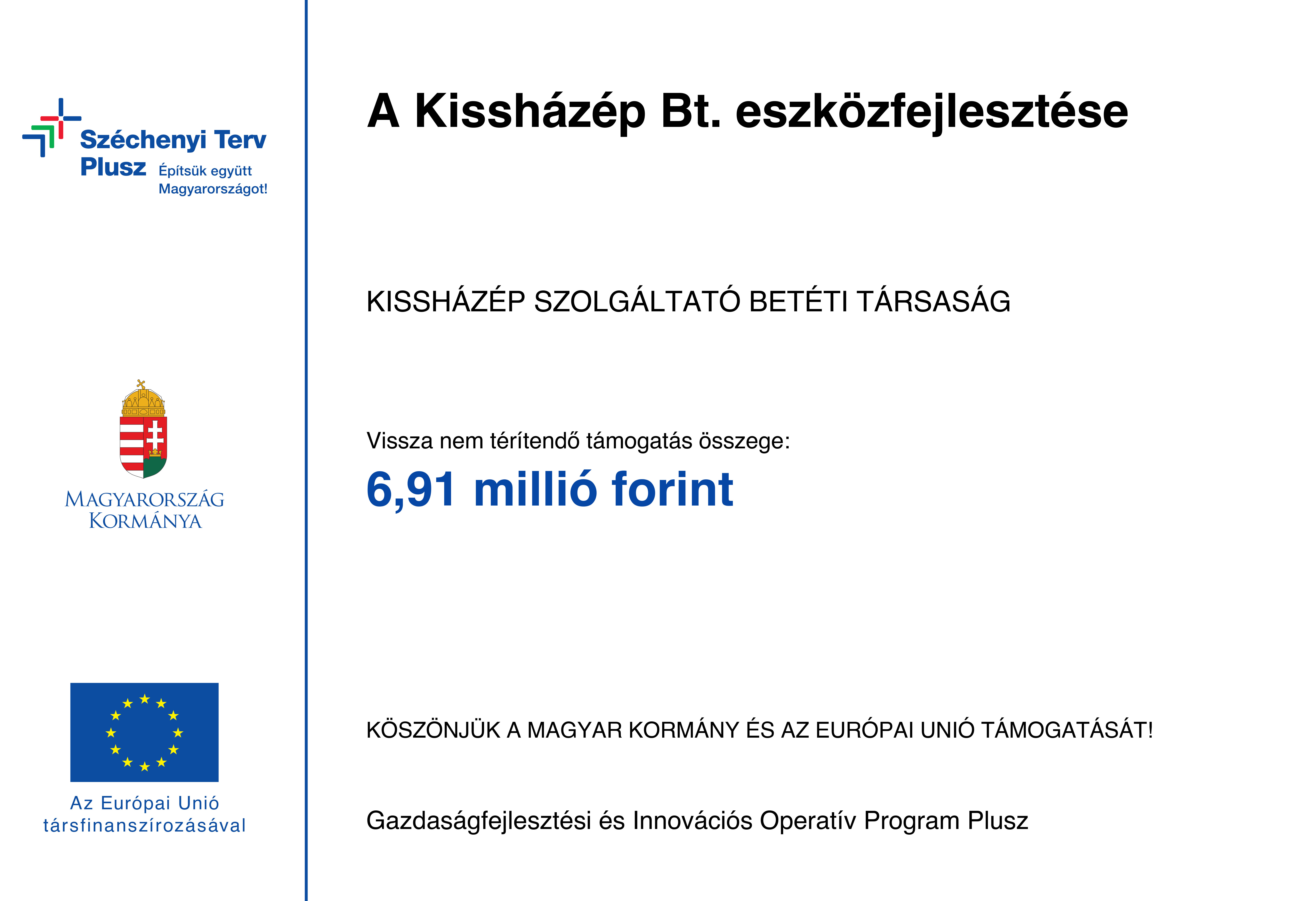A Gazdaságfejlesztési és Innovációs Operatív Program Plusz keretén belül a Miniszterelnökség, mint Támogató által meghirdetett GINOP Plusz-1.2.2-22 felhívásra a Kissházép Szolgáltató Betéti Társaság által benyújtott „A Kissházép Bt. eszközfejlesztése” című támogatási kérelmet pozitívan bírálta, támogatásra alkalmasnak ítélte, a Projekt megvalósítására 6.913.270 Ft vissza nem térítendő támogatást nyert el. A Projekt keretében egy darab Bobcat E19 minikotrógép és egy STD 50cm Klac típusú mélyásókanál került beszerzésre, mely a kivitelezések során a munkafolyamat lerövidítését eredményezi. Ennek következtében a feszes határidők könnyebben tarthatók, valamint a korábban beszerzett és a jelen pályázati támogatással beszerzett gépek használatával nagyobb megrendelések is elvállalhatók. A meglévő eszközpark új eszközzel való kiegészítése által kapacitás növekedés valósult meg, nőtt a társaság versenyképessége, a munkafolyamatok szervezettebbé és hatékonyabbá váltak. A Projekt a Magyar Korány és az Európai Unió támogatásával, a Gazdaságfejlesztési és Innovációs Operatív Program Plusz keretében valósulhatott meg