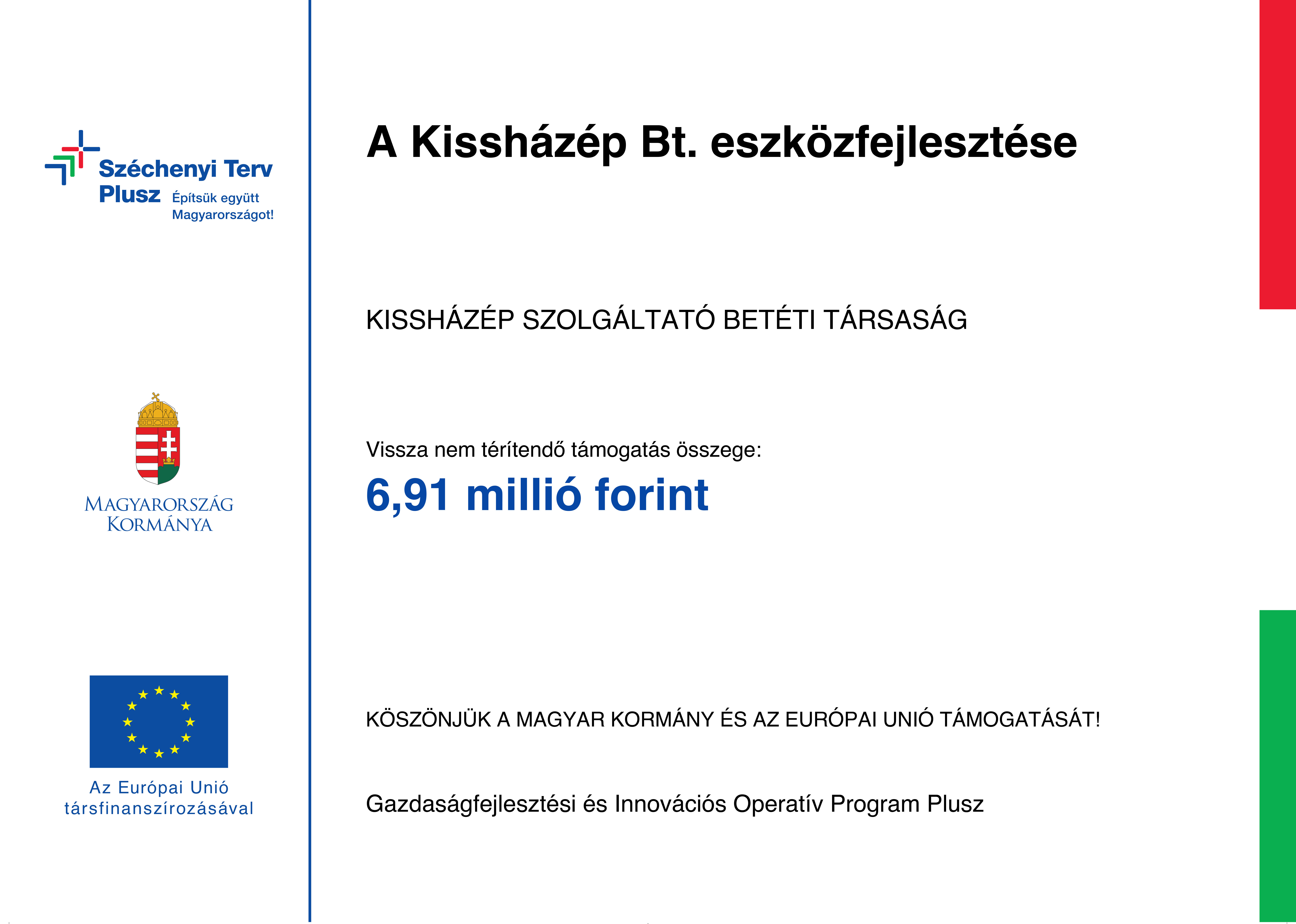 A Gazdaságfejlesztési és Innovációs Operatív Program Plusz keretén belül a Miniszterelnökség, mint Támogató által meghirdetett GINOP Plusz-1.2.2-22 felhívásra a Kissházép Szolgáltató Betéti Társaság által benyújtott „A Kissházép Bt. eszközfejlesztése” című támogatási kérelmet pozitívan bírálta, támogatásra alkalmasnak ítélte, a Projekt megvalósítására 6.913.270 Ft vissza nem térítendő támogatást nyert el. A Projekt keretében egy darab Bobcat E19 minikotrógép és egy STD 50cm Klac típusú mélyásókanál került beszerzésre, mely a kivitelezések során a munkafolyamat lerövidítését eredményezi. Ennek következtében a feszes határidők könnyebben tarthatók, valamint a korábban beszerzett és a jelen pályázati támogatással beszerzett gépek használatával nagyobb megrendelések is elvállalhatók. A meglévő eszközpark új eszközzel való kiegészítése által kapacitás növekedés valósult meg, nőtt a társaság versenyképessége, a munkafolyamatok szervezettebbé és hatékonyabbá váltak. A Projekt a Magyar Korány és az Európai Unió támogatásával, a Gazdaságfejlesztési és Innovációs Operatív Program Plusz keretében valósulhatott meg